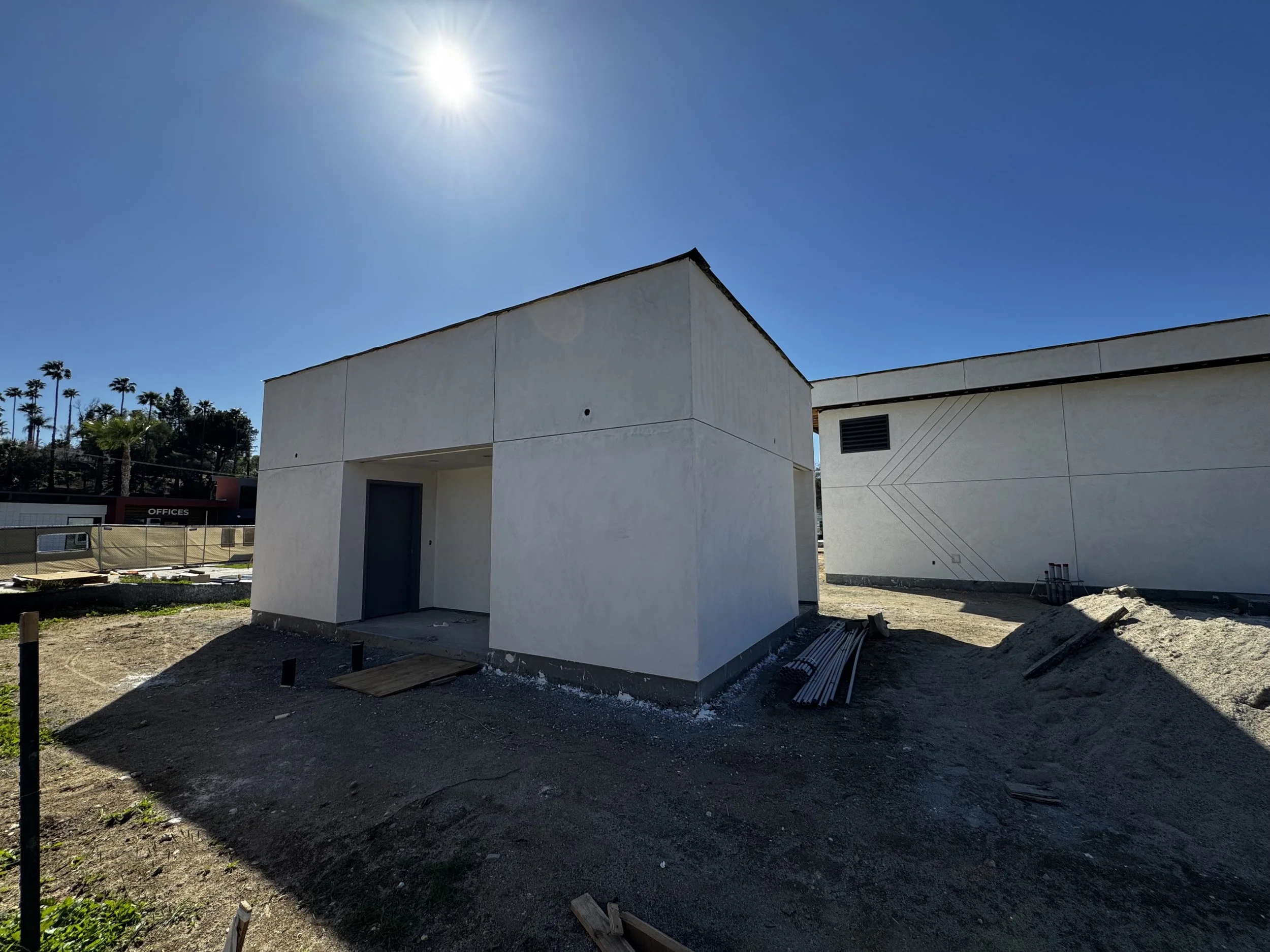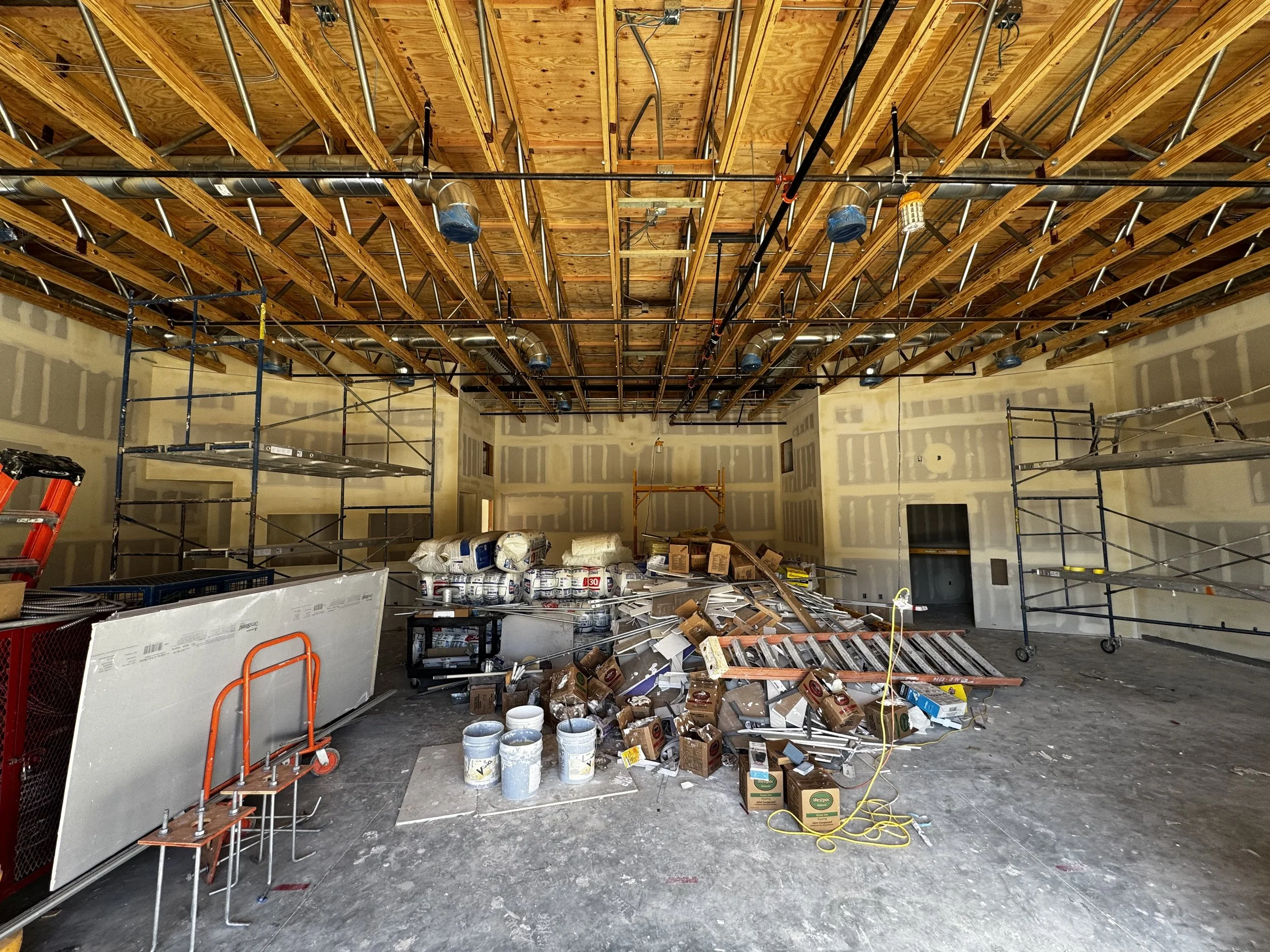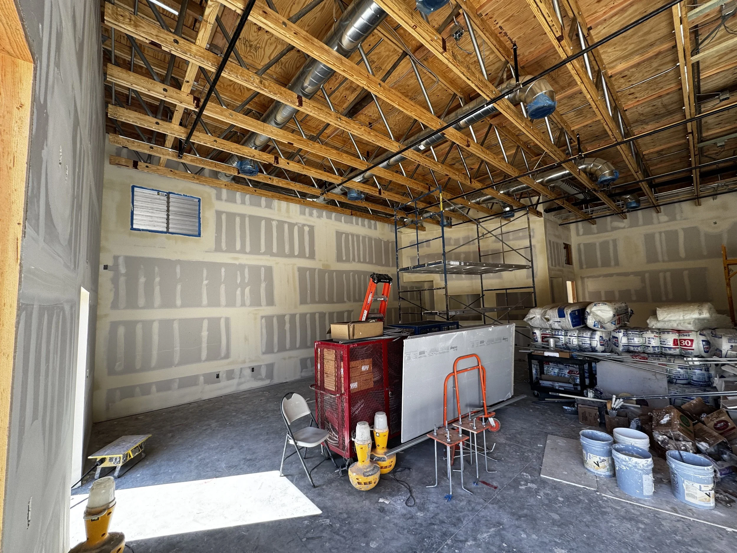 Here’s a photo-heavy update of the work being completed! The work lately has involved drywall, fire sprinklers, and stucco finish.